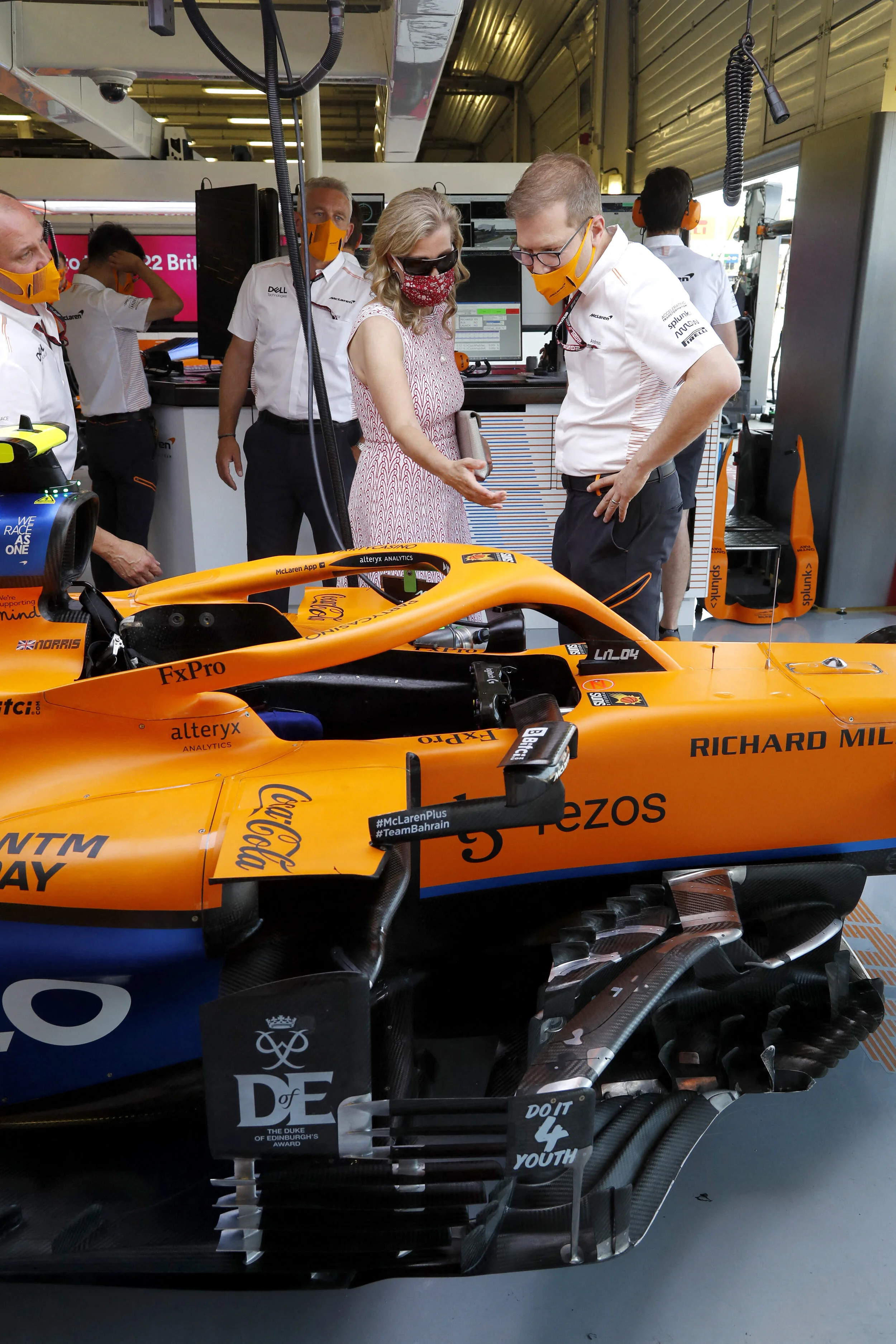 Prince Edward, Earl of Wessex and Sophie, Countess of Wessex during a visit to the McLaren team garage at the British Grand Prix in Silverstone on July 18, 2021 in Northampton, England. Before the start of the race at Silverstone, Edward and Sophie met McLaren drivers Lando Norris and Daniel Ricciardo and their team which is joining forces with the DofE to encourage the public to take part in the charity's new fundraising challenge Do It 4 Youth.