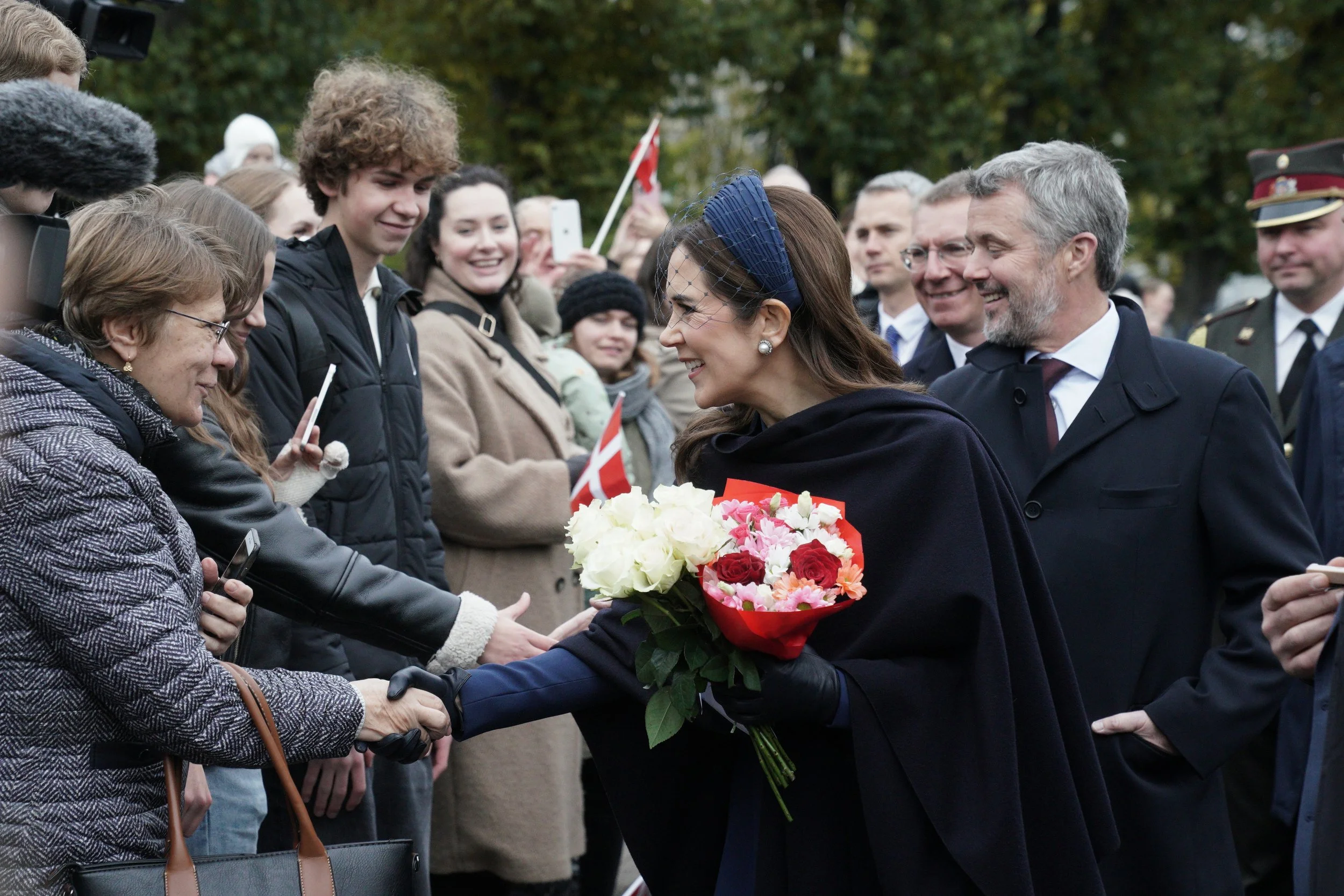 King Frederik X and Queen Mary of Denmark pay a state visit to Latvia and are welcomed by Latvia's President Edgars Rinkevics during a welcome ceremony at the Riga Castle, the president's official residence, on 28 October 2025 in Riga, Latvia.