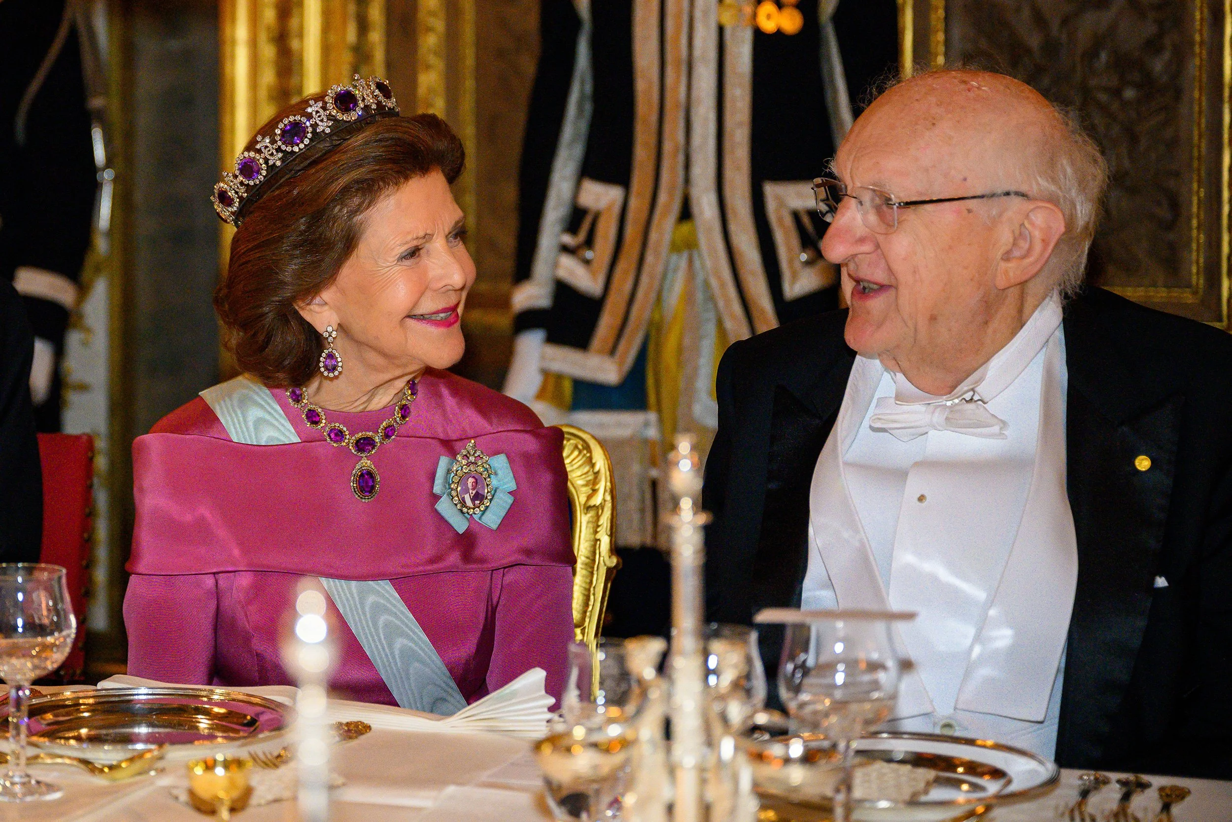 King Carl XVI Gustaf and Queen Silvia of Sweden host an official dinner in honour of the 2025 Nobel Laureates at the Royal Palace on 11 December 2025 in Stockholm, Sweden.