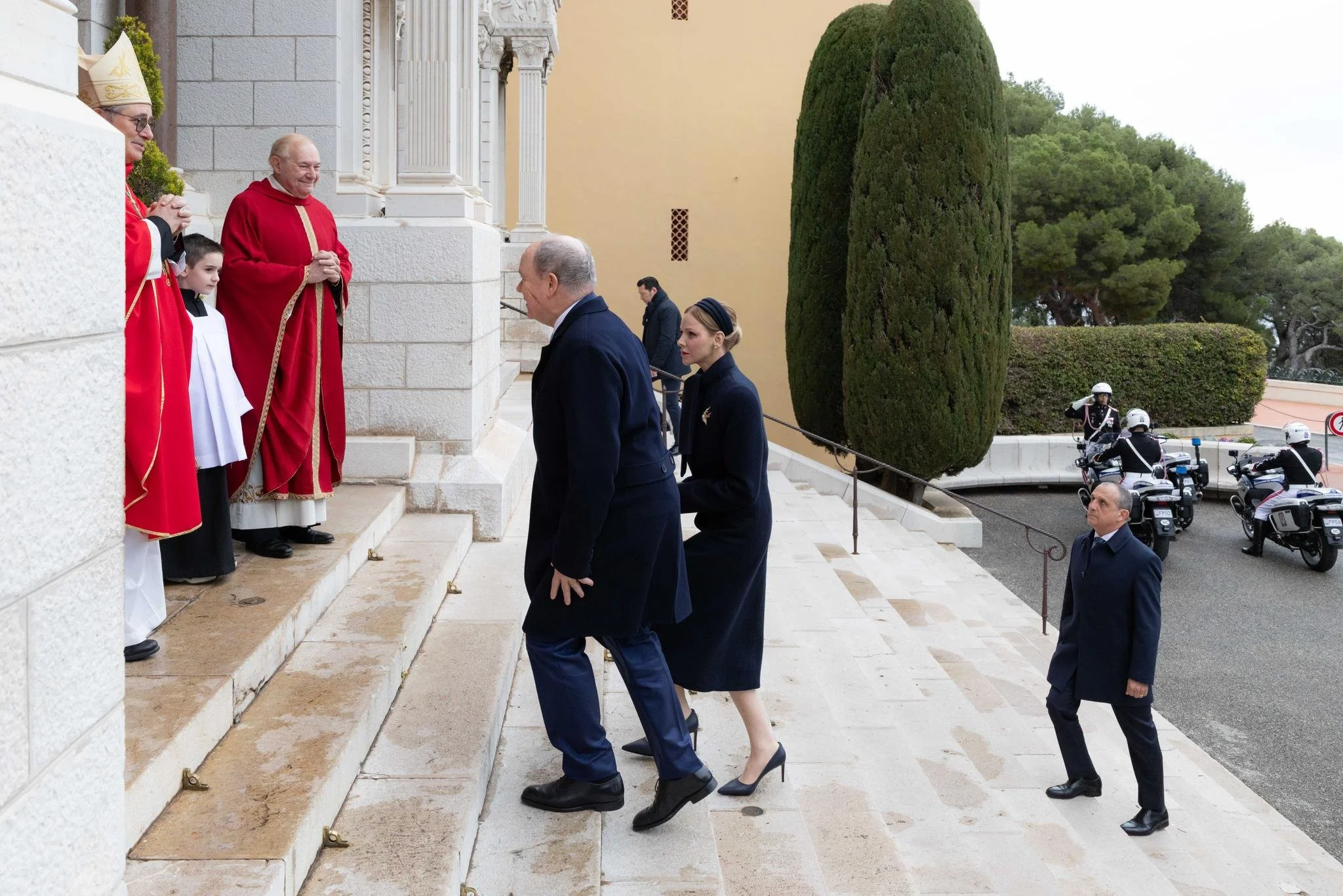 Prince Albert II of Monaco and Princess Charlene of Monaco leave the cathedral after taking part in the traditional festivities of Sainte Dévote at the Cathedral of Our Lady Immaculate on 27 January 2026 in Monaco, Monaco.