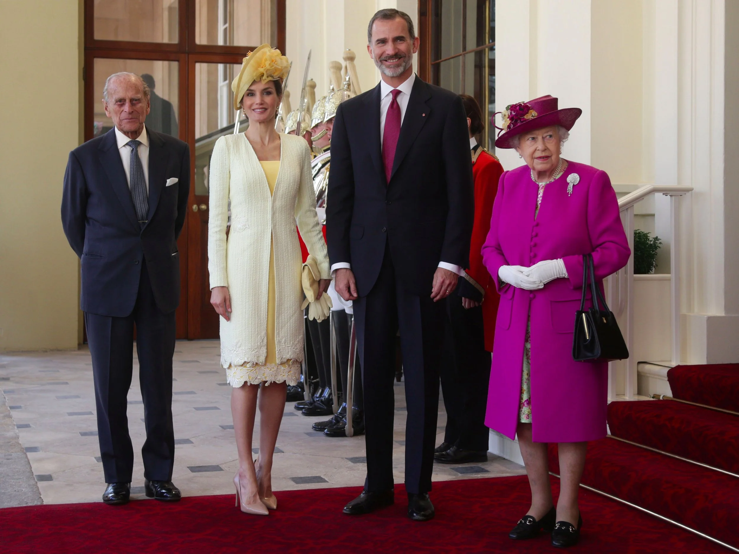 Queen Elizabeth II, King Felipe VI of Spain, Queen Letizia of Spain and Prince Philip, Duke of Edinburgh attend the ceremonial welcome at Horse Guards Parade on day 1 of Spanish State Visit on July 12, 2017 in London, England.